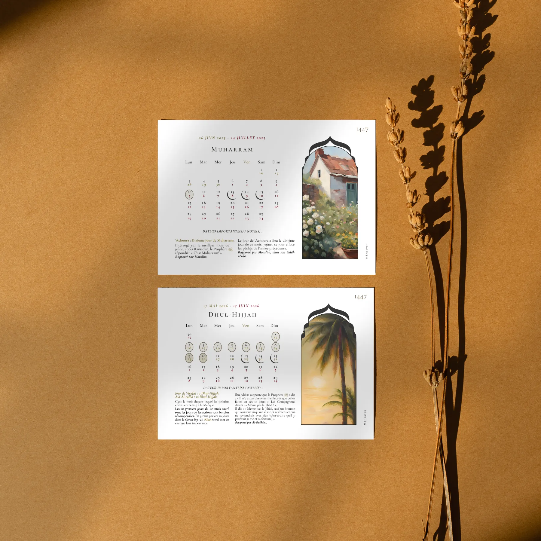 Les cartes sont illustrées dans un univers bucolique et présentent les mois du calendrier hégirien avec des repères lisibles. L’impression est réalisée sur une seule face (recto), le verso restant vierge.