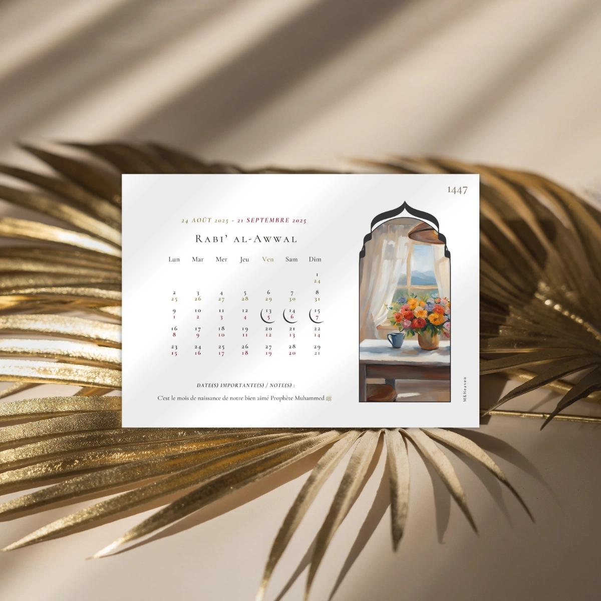 Ce calendrier hégirien est conçu pour offrir une lecture claire et structurée de l’année, tout en s’intégrant élégamment dans votre espace.