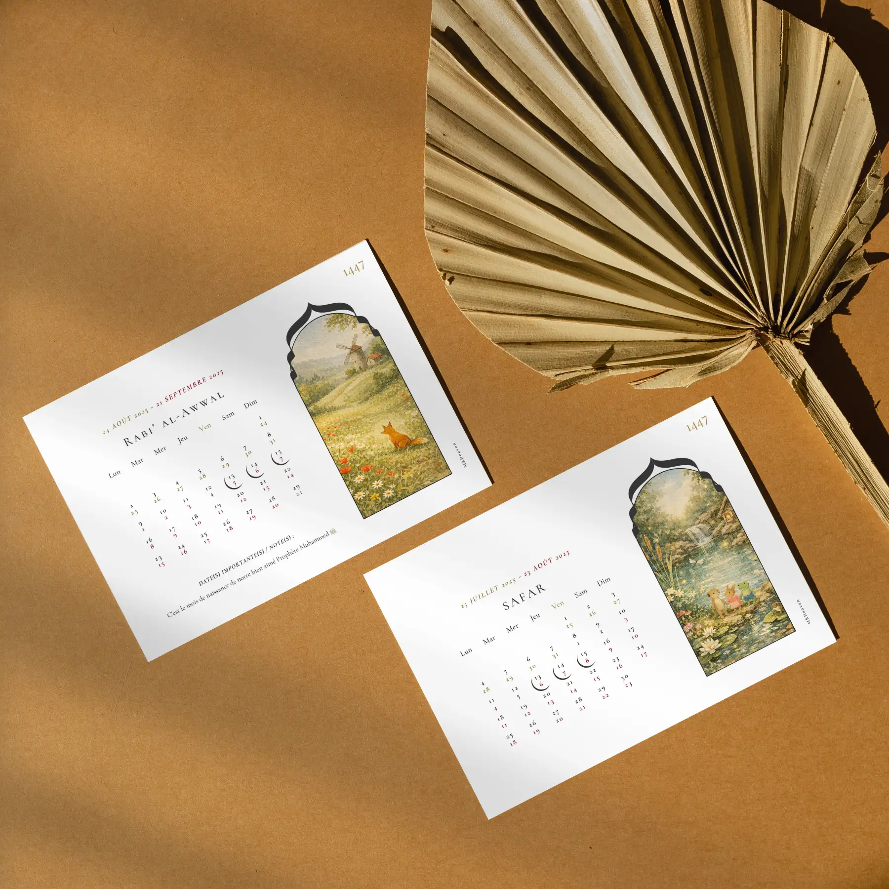 Les cartes sont illustrées dans un univers tendre et présentent les mois du calendrier hégirien avec des repères lisibles. L’impression est réalisée sur une seule face (recto), le verso restant vierge.