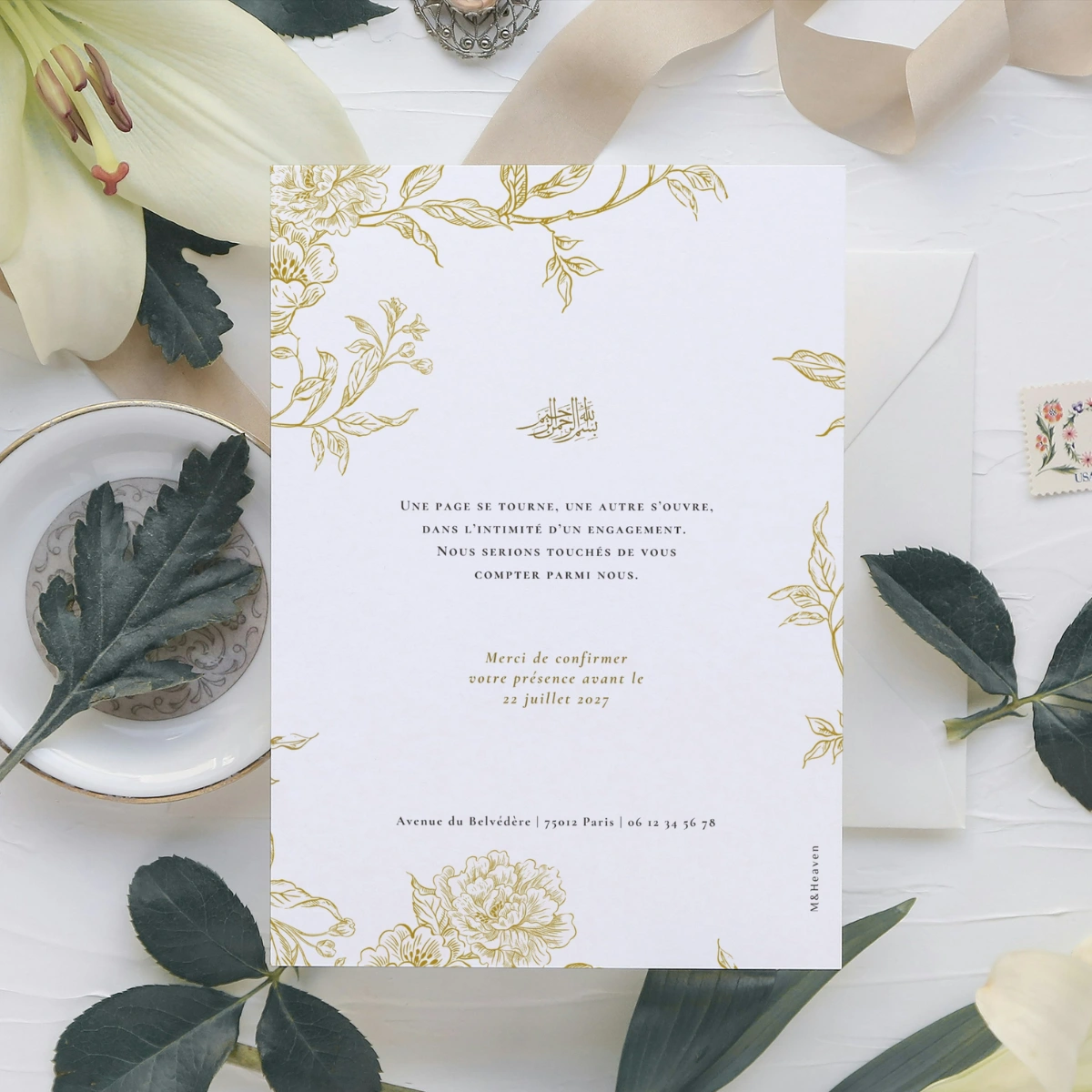 Le faire-part Arche précieuse à l’élégance intemporelle souffle un air romantique , entre gravure ancienne et mariage contemporain.
