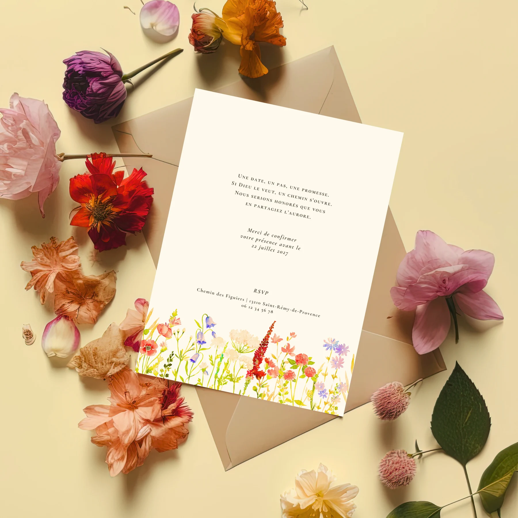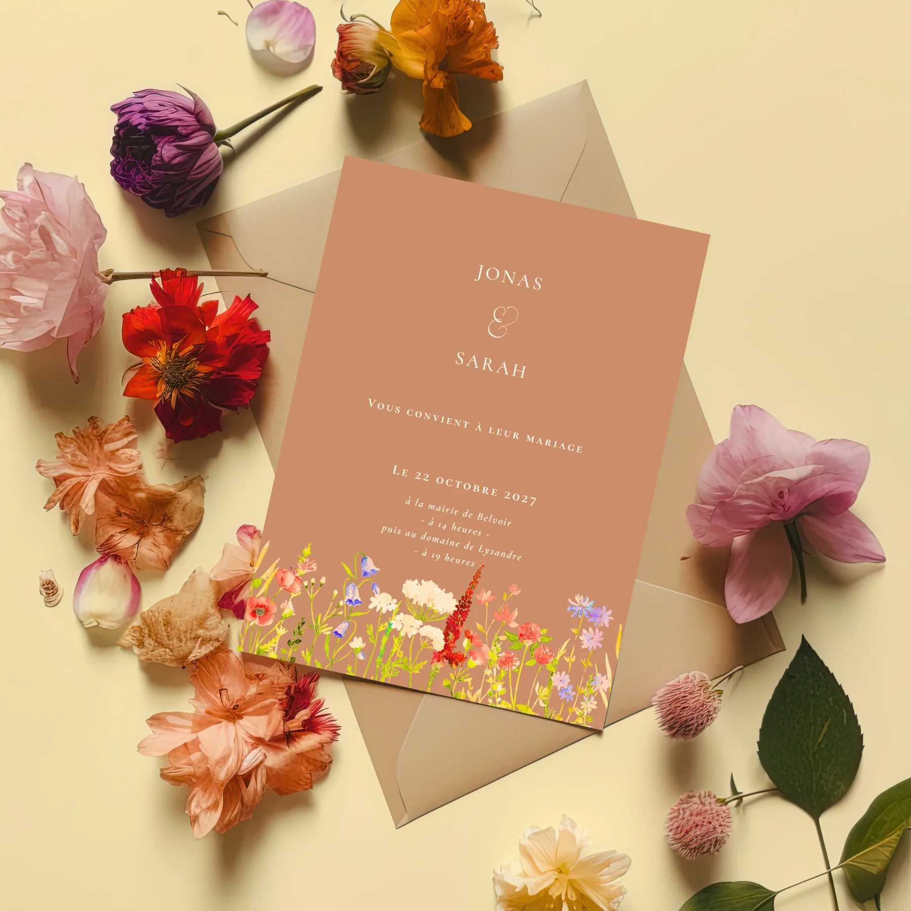 Fleurs des champs est un faire-part de mariage au design soigné, associant fond coloré chaleureux et illustration florale délicate.