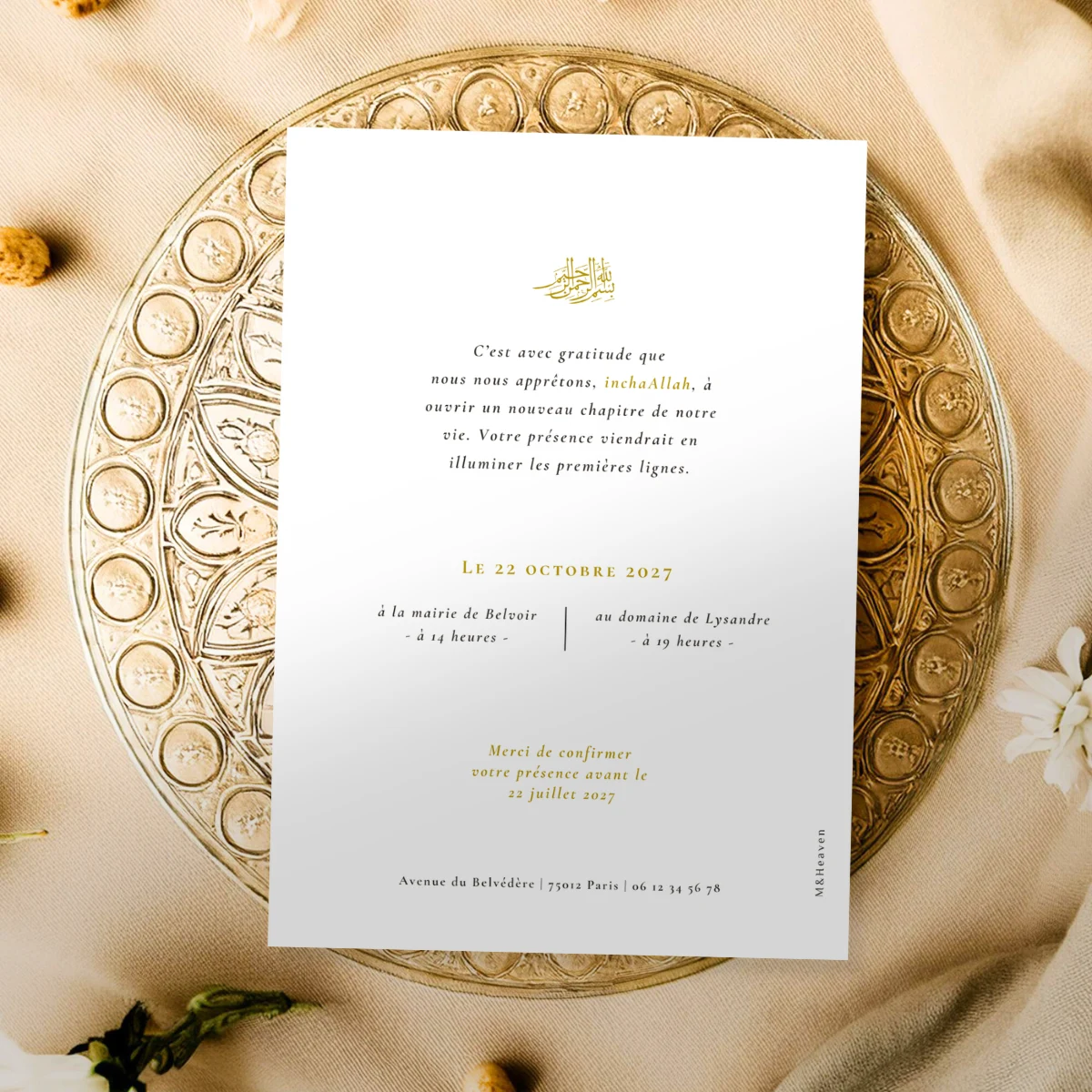 Personnalisez votre faire-part en renseignant les éléments essentiels de votre mariage. Nous harmoniserons l’ensemble avec soin.