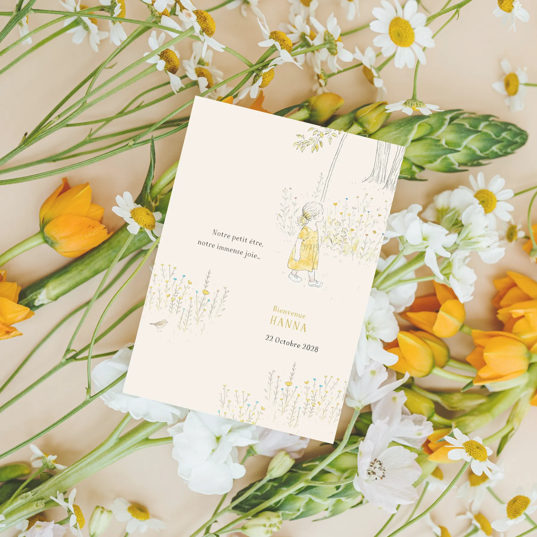 La carte de naissance Hanna est une création illustrée au style tendre et délicat, pensée pour annoncer l’arrivée d’un enfant avec douceur. Elle s’adapte à votre usage : selon le texte renseigné lors de la personnalisation, elle peut servir d’annonce de naissance ou d’invitation pour présenter le bébé.
