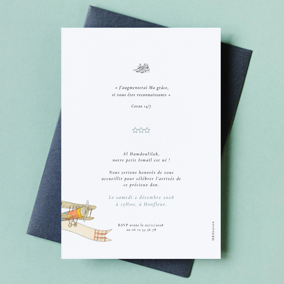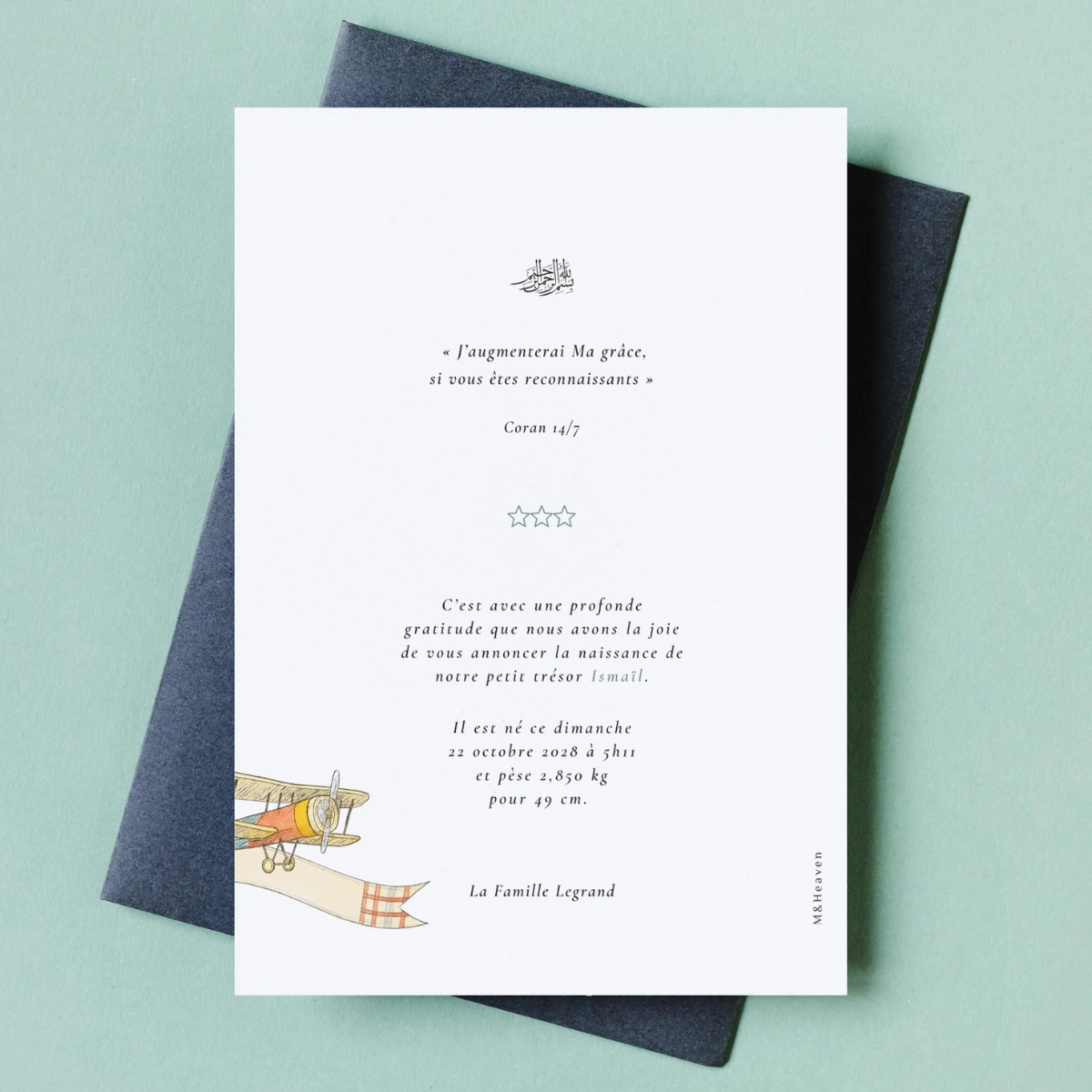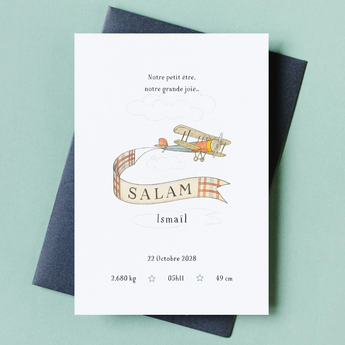 La carte de naissance Premier voyage est une création illustrée au style tendre et délicat, pensée pour annoncer l’arrivée d’un enfant avec douceur. Elle s’adapte à votre usage : selon le texte renseigné lors de la personnalisation, elle peut servir d’annonce de naissance ou d’invitation pour présenter le bébé.