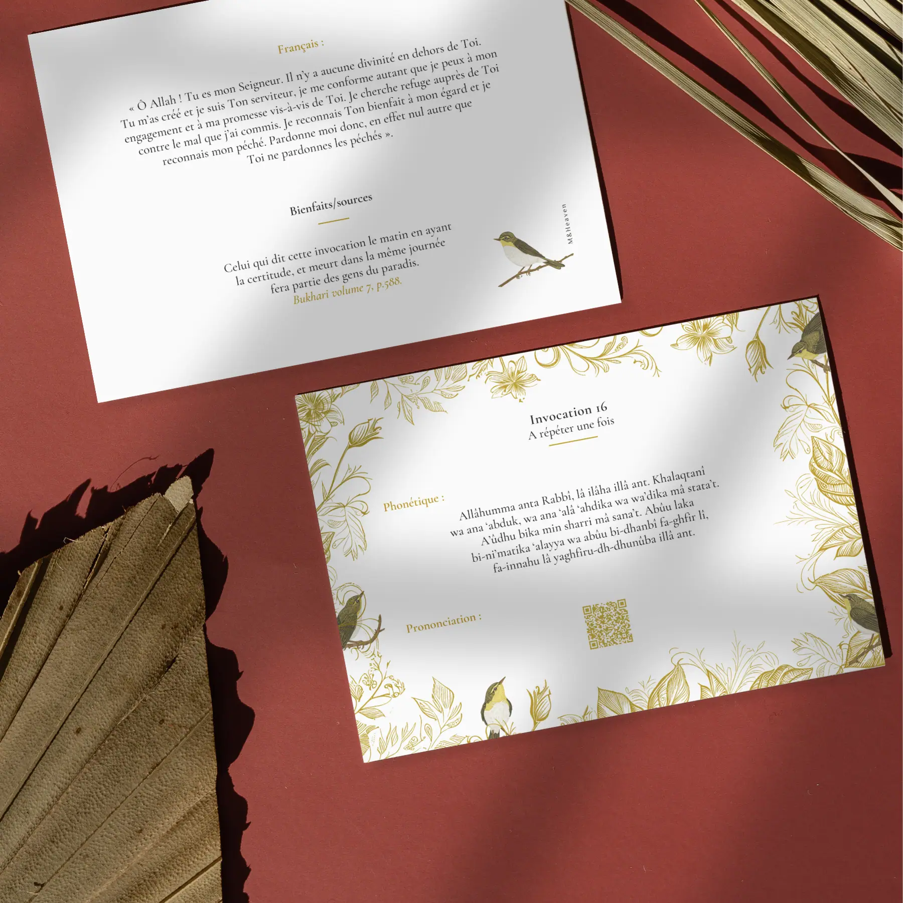 Chaque carte présente l’invocation en translittération, sa traduction en français, ainsi que ses références et bienfaits. Cet ensemble permet une approche progressive, adaptée aussi bien à l’apprentissage qu’à la révision, dans un cadre clair et structuré.