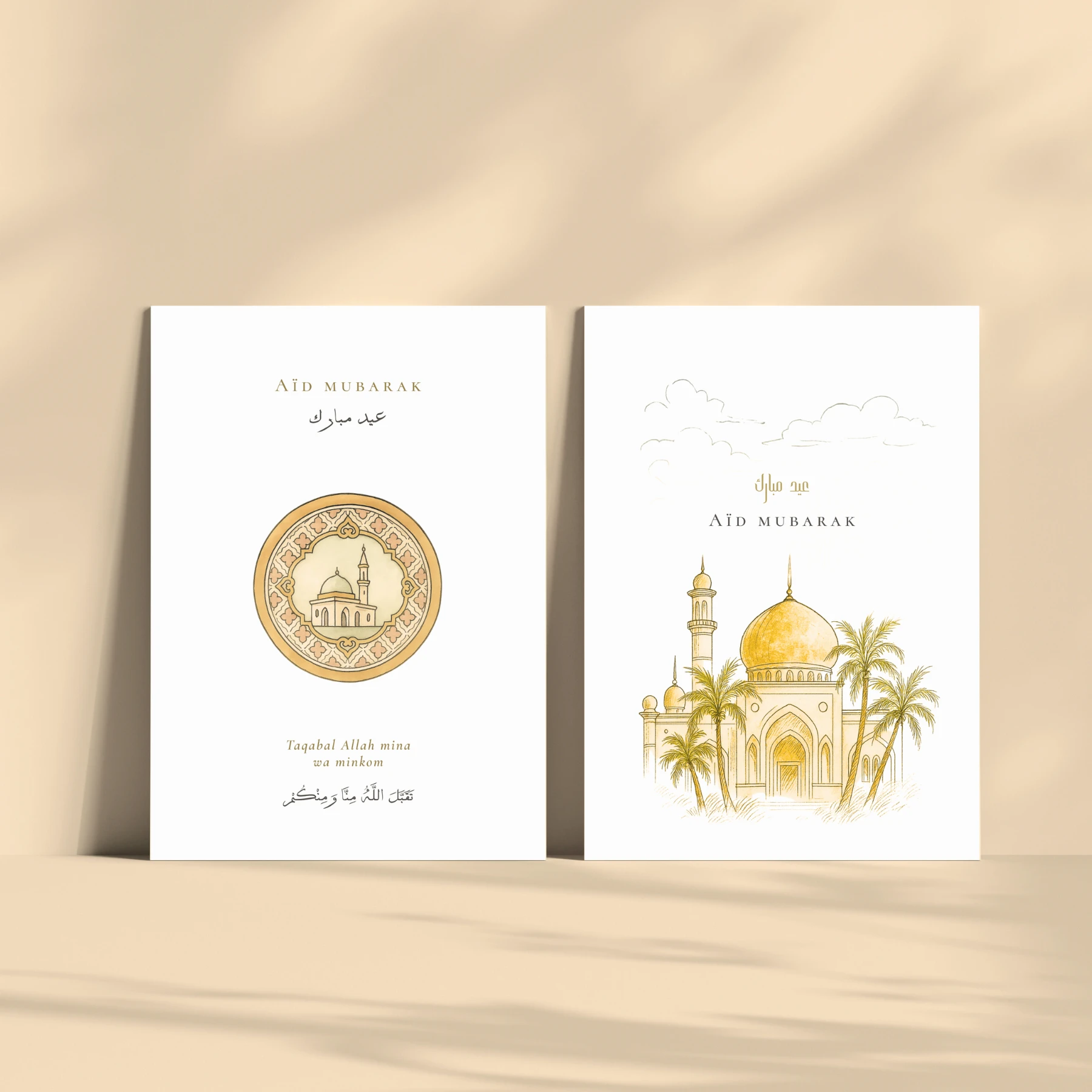 La sélection Épuré réunit 6 cartes de vœux illustrées, comprenant 4 cartes dédiées à l’Aïd (Aïd al-Fitr et Aïd al-Adha) et 2 cartes pour le mois de Ramadan. Les illustrations privilégient des lignes sobres et des compositions équilibrées.
