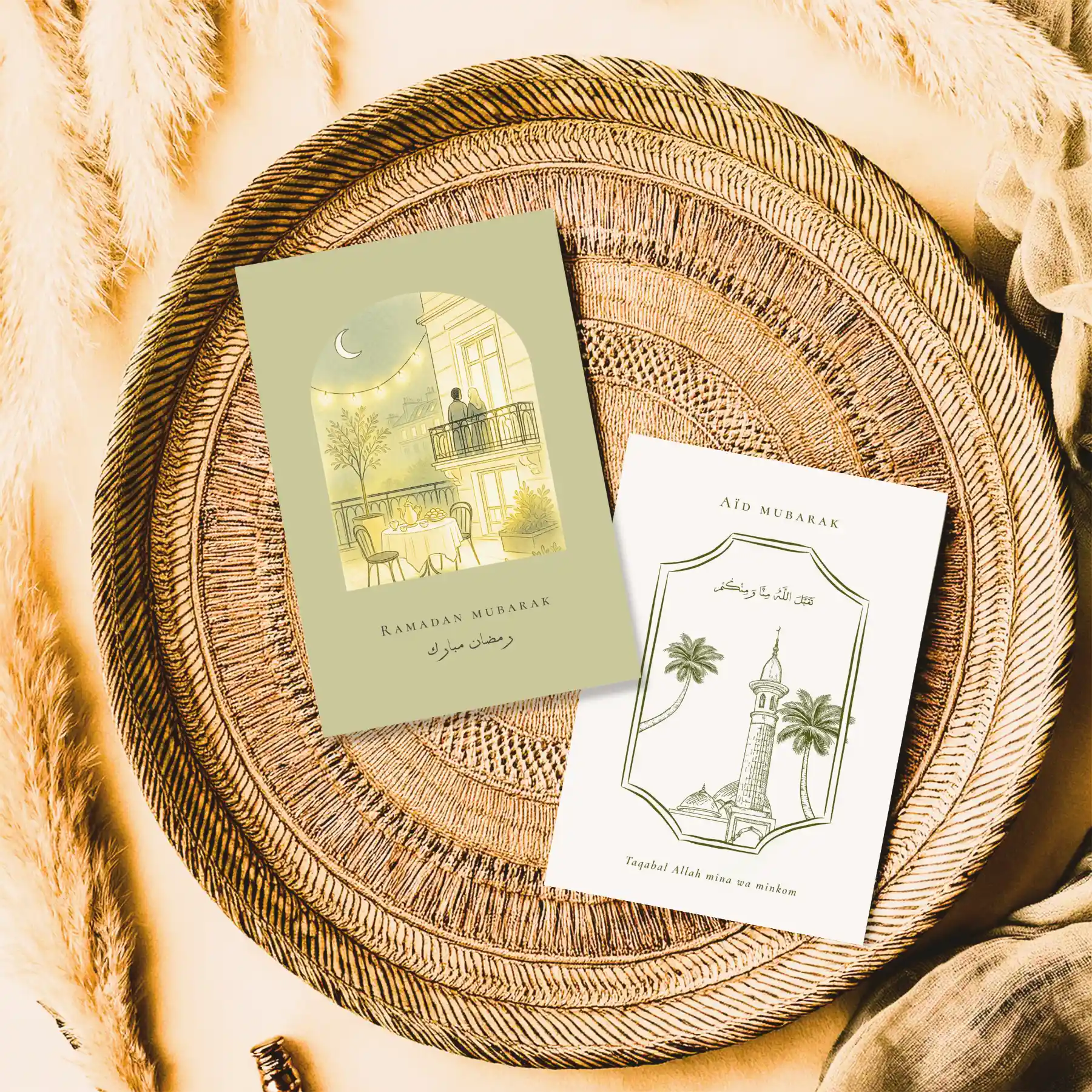 La sélection Harmonie réunit 6 cartes de vœux illustrées, comprenant 4 cartes dédiées à l’Aïd (Aïd al-Fitr et Aïd al-Adha) et 2 cartes pour le mois de Ramadan.